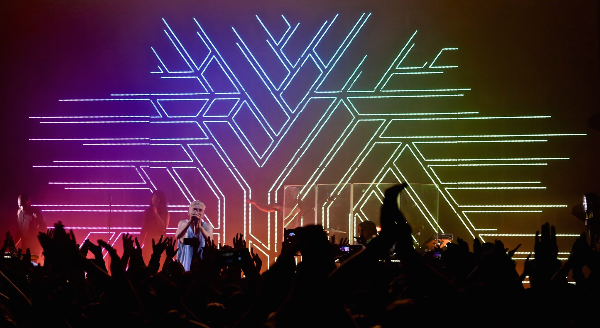 The concept for the LED screen was the idea of Years and Years lighting designer Chris 'Squib' Swain. It reflects the cover artwork for the band's debut album 'Communion', with coloured branches of LED strips intersecting at different angles from a central 'Y' shape.