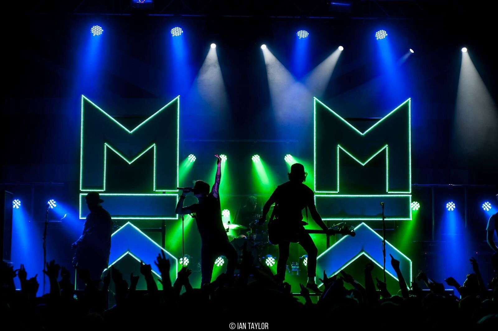 The team opened each show with a giant Union Jack backdrop to mark the homecoming, and designed two large set pieces either side of stage which were based on Mallory Knox's 'MK' logo, seen on the album artwork for 'Asymmetry' - their second album. Both of the letters were outlined with LED tape, with individual DMX control. More than 35 metres of LED tape was used in total.