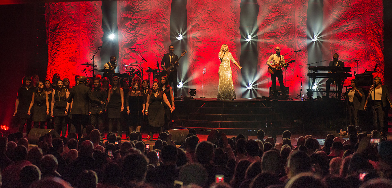 One of the main focal points of the show was the five pillars rigged at the back of the stage, created from Showtex's AluShape. Thompson specified x2 Avolites Ai S8 servers at stage end running over ArtNet, controlled by the Sapphire Touch, to power visuals created by Dan Robinson and projected via x2 21k Panasonic projectors.