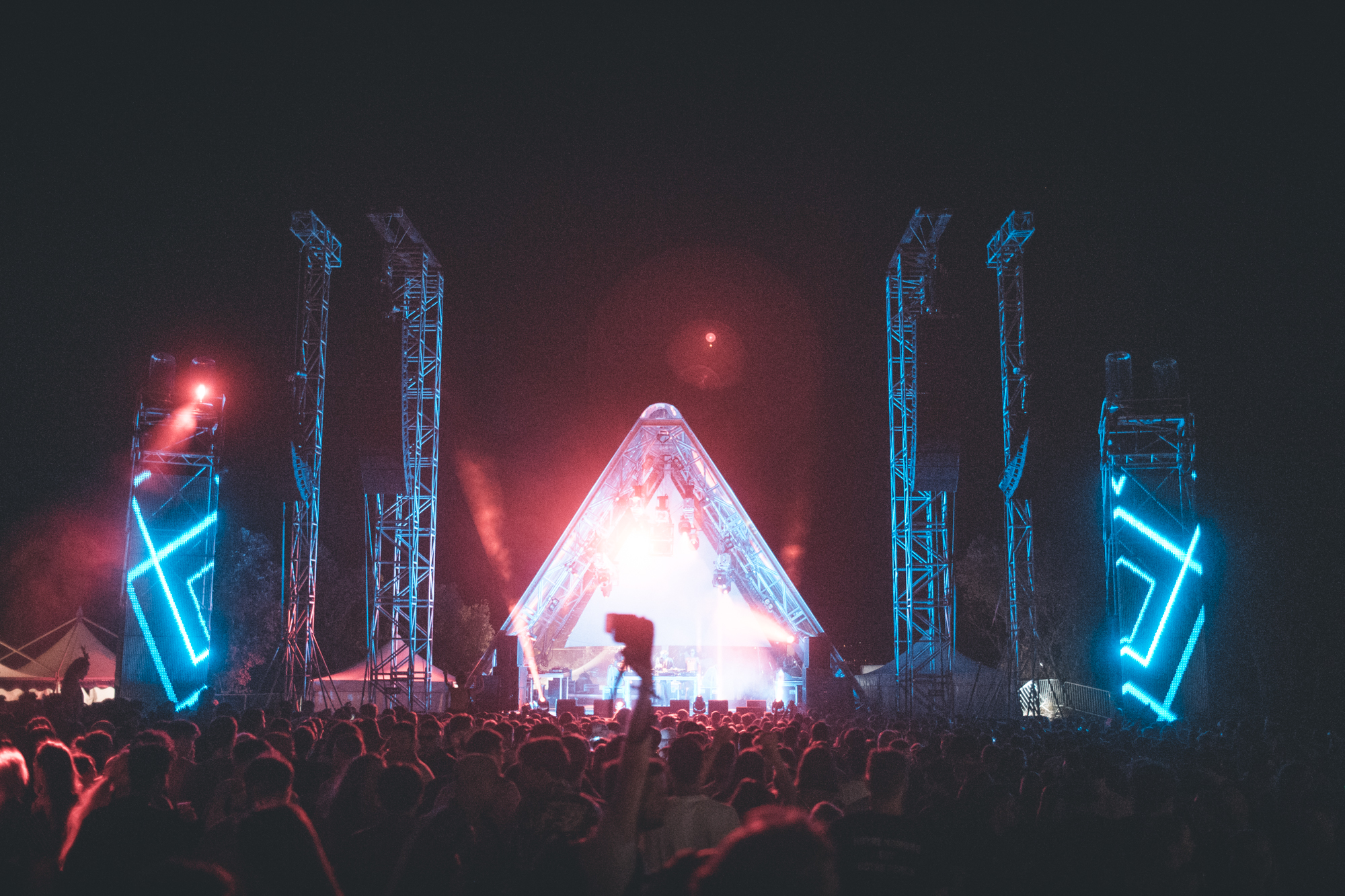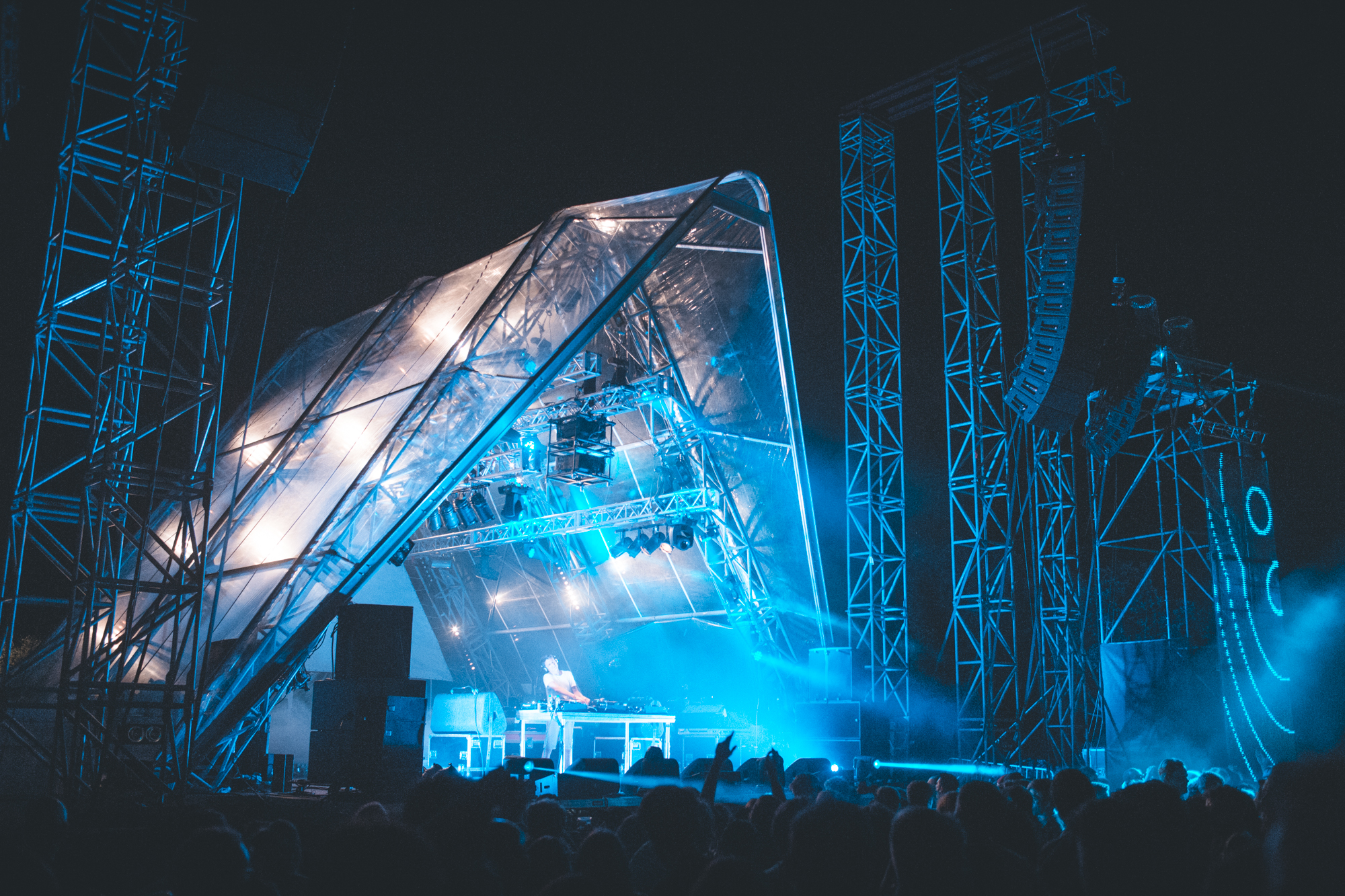 Sangwell and his team's biggest task was Outlook and Dimensions' flagship stage The Clearing, which boasted headline acts such as Stormzy, Andy C, David Rodigan, Noisia and Lary Heard AKA Mr Fingers. The stage itself was a 10m wide by 10m high triangle with a clear skin. Alongside the on-stage video and lighting system were four towers of video and moving lights, with further video panels also installed on the PA masts.