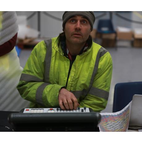 Chris Wilson, WLX Productions Ltd, during temporary warehouse installation, Winter 2015 (Photo: Mat Clark)